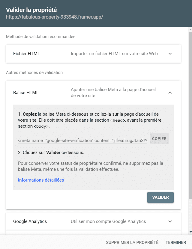 Validation de la propriété sur la Search Console