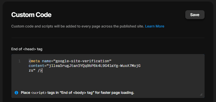 Revenez dans Framer, ouvrez les paramètres généraux de votre site et collez la balise dans la section “head”.
