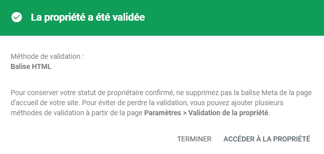 Si tout est correct, Google confirmera que votre site est désormais “Propriété validée”.