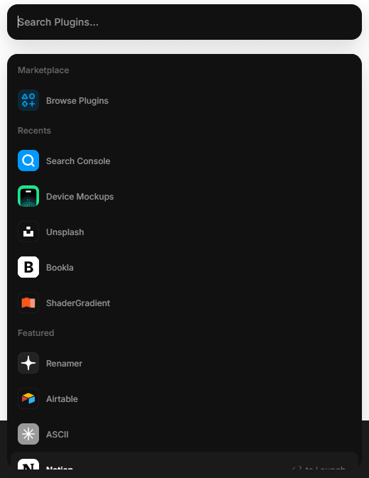 Dans Framer, cliquez sur l’onglet “Plugins” puis recherchez “Search Console”.
