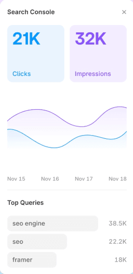 Gagner du temps : plus besoin de se connecter en permanence sur la Search Console, le plugin centralise les informations essentielles dans Framer.