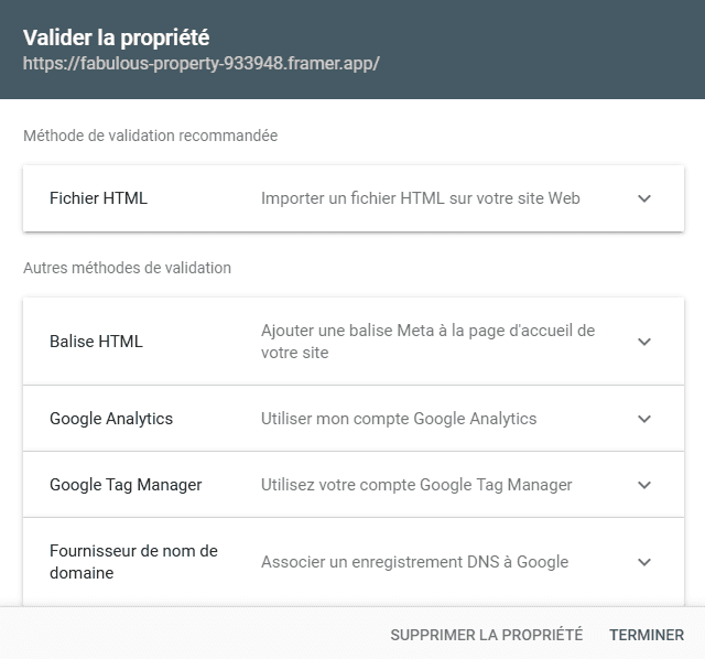 Choix de validation de propriété sur la Search Console